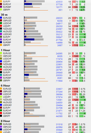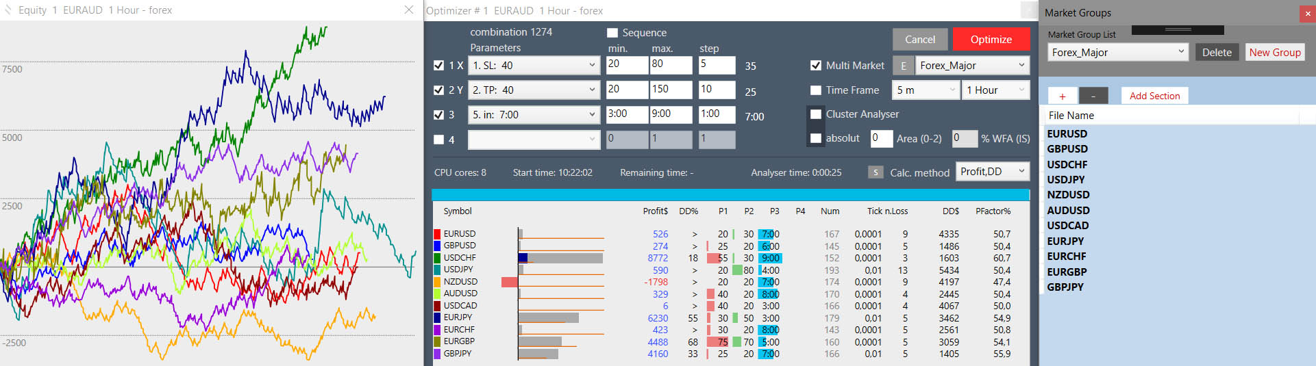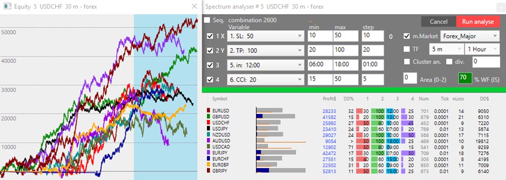 After optimization, a list of all results markets and a new window of Equities for each market together (color-coded) will be listed in the main window. Timeframe: If we mark TF, we can set the range of TF that each market should test. We can test multiple TFs on one market only and disable the “Multi market”. WFA (IS): To use Walk Forward Analysis, enter a percentage for the InSample (typically 50-80%). Standard is 0 – off Wfa. In an open equity chart, OutSample will be marked with a blue area. When using Wfa in Multi Market, the beginnings of equity graphs go forward to align the IS-OS edge, and clearly outweigh the impact of this break on each equity. Cluster Analyzer: Optimizer runs in Cluster Wfa mode. Heat map is colored by rating: the best is pale green, green, red, black. Each field contains: Profit (all OutSample zones), Wfeff% (Wfa efficiency, recovery rate ratio in IS and OS), Drawdown (should not be greater than 20%), the ratio between loss and profit time sector. If you click on the cluster box, you will see a list of the individual time slots with the resulting parameters and the equity curve with the marked area of ​​the OS (blue area) and the time slots separated by the red line. Absolute: IS slots will have a precise time division by months.