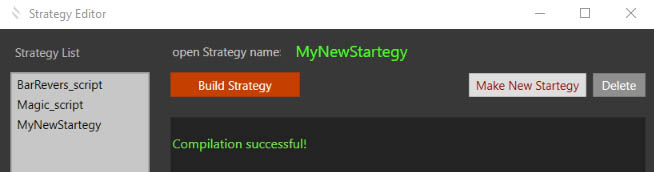 Press the “Make New Strategy” button, type the name of the new strategy, press “OK”. The text editor opens a new strategy code with a pre-structured code and a simple example of a strategy that you can delete or edit as you like.