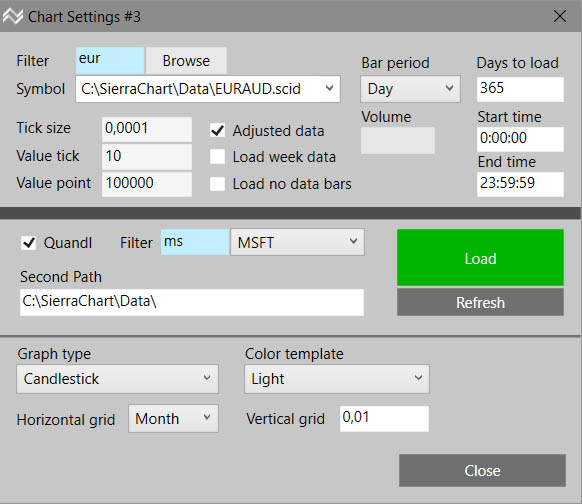 We set market, format, and display style in chart settings. Filter: write the starting letters 1 and more than the filter for faster search. Symbol: In the scrolling list, we can select a given market. (markets are searched for “./Data/” and SecondPath) If we know the exact symbol we can write it straight (without suffix). In this case, the search directory for the “./Data/“, then Second Path folder is searched, and finally, trying to retrieve from an external source (for example, SierraChart or Quandl if the checkbox Quandl is enabled). If the disk data with a shorter history how is required then the program tries to retrieve data from an external source. Using Browse, you can choose any data file from the disk. Tick size, Value tick, Value point data are automatically set according to the selected market. If you used the non-standard symbol name, these values ​​will need to be filled by yourself. The manually edited fields will be blue. Bar Period: Time Frame from 1 second to 1 month. Timeframe under 1 minute is only possible if we have tick data. Time Frame Volume and Range are exotic formats that we recommend using only exceptionally if it has some logical sense for that strategy. If we select Volume or Range TF, we still have to fill under the “Bar period”. “Volume”: Number of trades per bar, “Range”: Maximum bar height (price range). These formats also require tick data, we also seeing with a minute data, but then we only have to measure only with the information value of such charts. Days to load: the number of days that will appear in the chart. Load week data: if uncheck does not load weekend data (Saturday, Sunday, midnight to midnight). Beware of data that will be omitted depends on the selected time zone! Load no data bars: create those bars where there was no trade. Start time, End time: You can only load a certain part of the day. This feature is only suitable for intraday transactions. Beware of changing the value of the indicators! Default is set all day. Load: load the set symbol. Refresh: When connected to an external data source, it uploads new data. Market saved on disk will be updated. (applicable to SierraChart and Quandl) Quandl will prefer data from the Quandl source. The filter accelerated our search from the list of markets provided by Quandl. If a market is selected we will automatically copy it to “Symbol”. At the end of the table there are options for styling the chart.