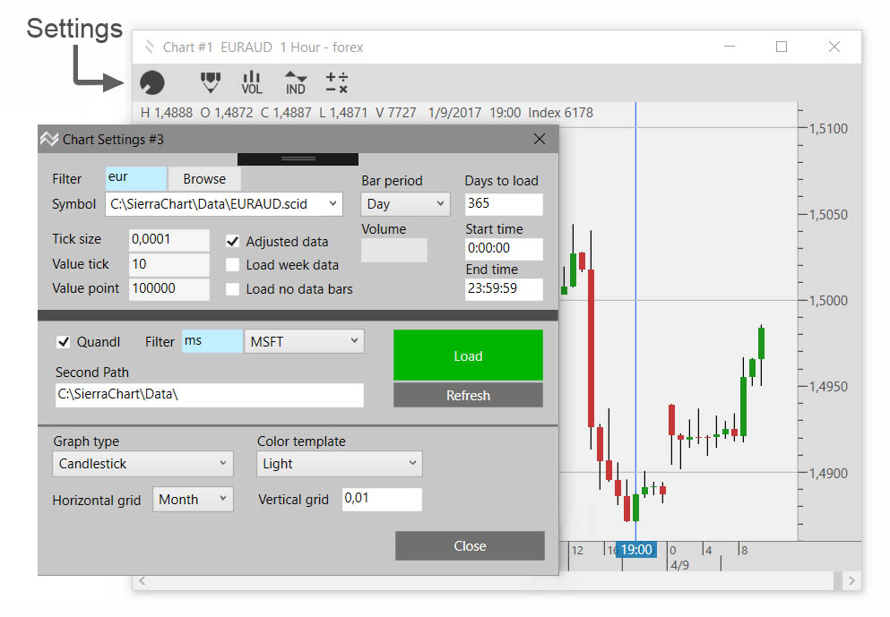 Press “Load”, it should load and plot the price chart. In order to retrieve the data, it must be stored either in the installation folder “.\ Data \” or in the “Second Path” folder which you can set in the Second path field. For example, if you use SierreChart as the data source, type “C: \ SierraChart \ Data \” directly into Second Path field. -more-