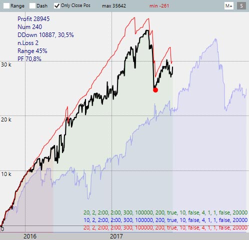 • Only Close Position: The red equity curve shows only closed trades. Black shows real equity (we can have many open positions that are currently in a loss or profit).