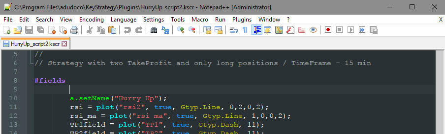 When first launched Notepad ++ must be set in the menu “Settings / Style Configurator / Select theme: Obsidian” and in the menu “Language: KeyStrategy”.