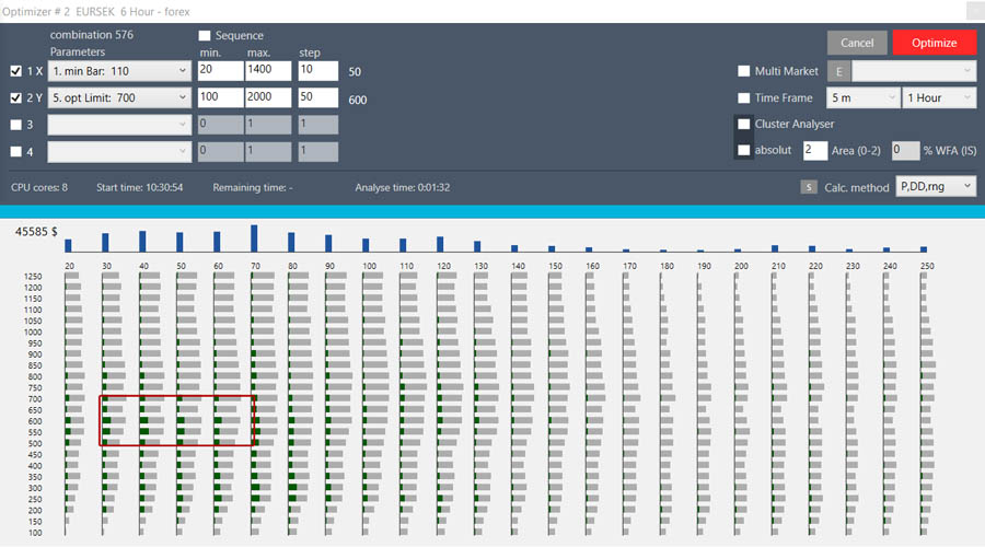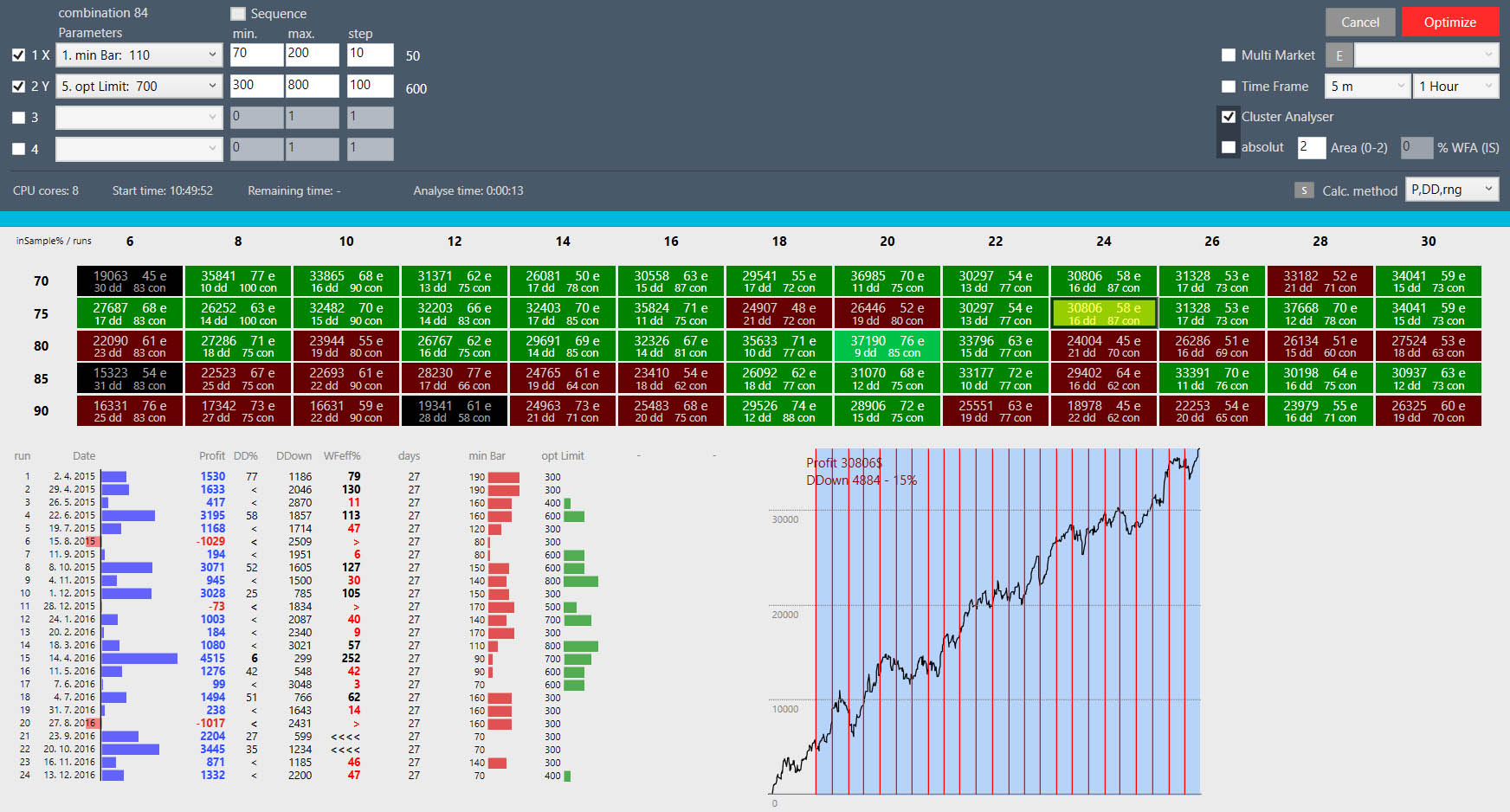 WFA Cluster Analysis: No test is perfect, the future can not be predicted, our best chance to succeed in the markets lies in maximizing testing and verifying the functionality of our system in the most comprehensive backtest with a long history. Have you gotten through the optimization of the most suitable parameters, followed by MMO and WFA testing here and you are satisfied with your result? WFA Cluster Analysis is still ahead. It analyzes the whole map of wfa analyzes with different IS-OS ratios and different depth histories in the relative and absolute raster. All tests are automatically evaluated and result in a Heat Map.