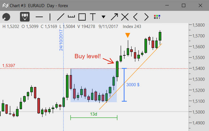 In the example of creating a simple strategy, we show the program’s control and the appropriate workflow. Run KeyStartegy. If you do not see the blue KeyStrategy log window go to the “Charts / Open Workbook“. Enter the name of the new strategy in the New WorkBook field. Press Create. A chart window is created. The Workbook can contain more Charts (“Charts / New Chart“). You can also create any number of Workbooks, but you can only have one open. If you want to open a new Workbook, the current one is automatically closed.