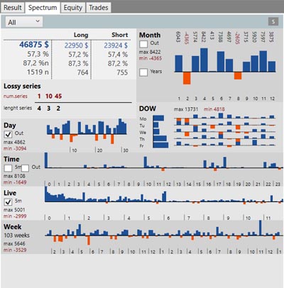 • Week: Weekly results. Each chart has its maximums (min, max) in order to have an idea of ​​what drawdown we can expect in the month, weekend … Using the Sprectrum module, we get a valuable idea of ​​what results and “surprises” we can expect from your Strategy.
